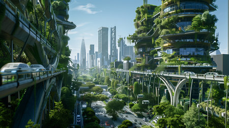 A visionary cityscape showcasing the integration of futuristic architecture with lush green spaces