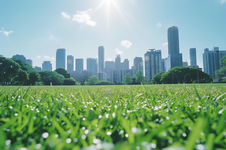 Lush green meadow and trees frame the impressive skyline of singapores financial district, creating a harmonious blend of nature and urban development on a bright, sunny day