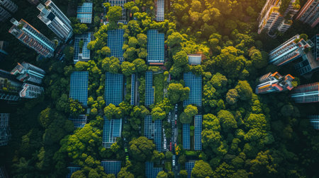 This aerial image showcases a modern urban landscape blending innovative architecture with lush greenery, highlighting sustainable city development and nature's integration.