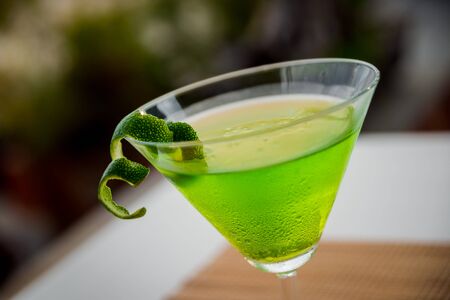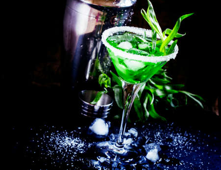 Green alcoholic cocktail martini glass with dry gin, vermouth, liquor, lime zest and ice, bar tools, dark background