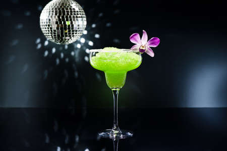Green margarita cocktail in front of disco lights