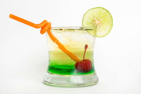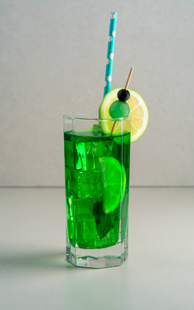 Front view of mint cocktail in tall glass garnished with lemon slice, blue sherbet and green cherry on white table