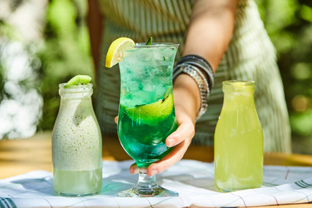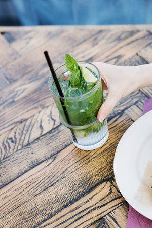 young girl's hand holding a glass with mohito lemonade cocktail in cafe