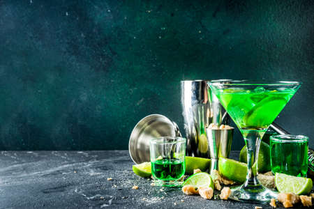 Strong alcohol cocktail. Absinth and vodka martini drink with sugar, ice cubes and lime, With ingredients, barmen utensils and shot glasses with absinthe. Dark stone background copy space