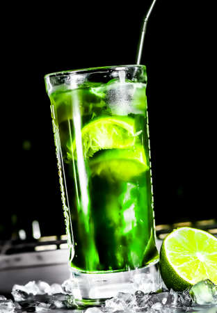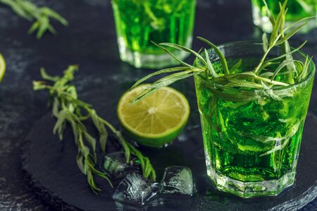 Green cocktail with lime, soda, crushed ice and tarragon leaves, black background, selective focus.