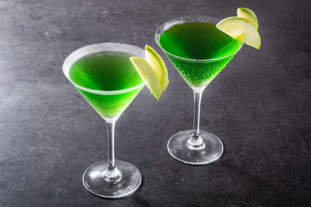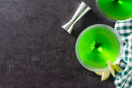 Green appletini cocktail in glass on black background.