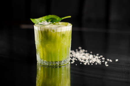 Glass of fresh green alcoholic cocktail decorated with basil leaf served on the dark surface. Drink concept