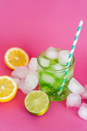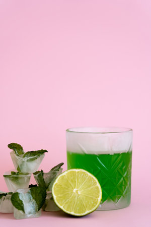 green and fresh lime in faceted glass with alcohol drink near ice cubes with peppermint on pink