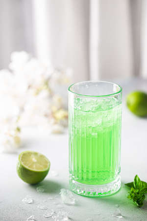 Summer green drink, lemonade with lime, basil and ice in a glass