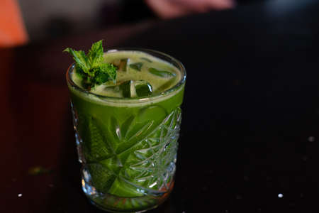 Green cocktail in modern glass on bar background.