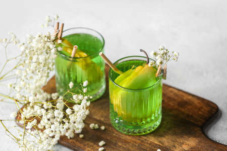Glasses of tasty cocktail on green background