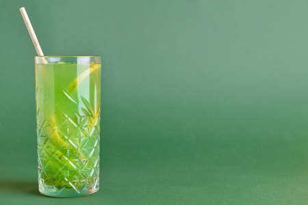 Lemonade or Cocktail Drink in coctail glass with straw, ice, mint leaves and lemon slice isolated on dreen background. Summer mojito drink poster or banner with copy space.