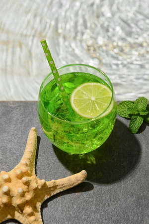Green cocktail in an ice glass garnished with lemon slice, mint leaves, lemon slices and ice cubes. The concept emphasizes the coolness, freshness and creative presentation of summer fruit drinks