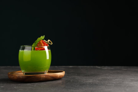 Glass of green cocktail with bacon and celery on black background