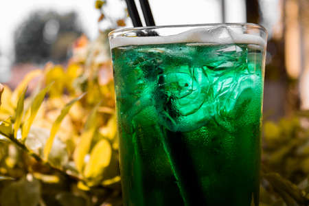 Green drink in a glass. Green water or limnad. A splash of green liquid similar to absinthe. Alcohol and alcoholism.
