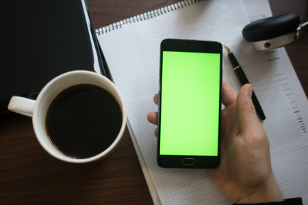 A close-up shot of a smartphone with a green screen display on a table with a coffee cup. The phone is placed in the foreground, while the coffee cup is in the background.