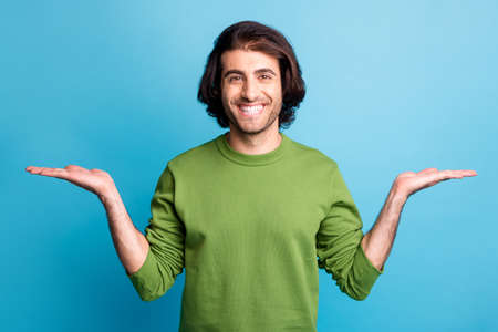 Photo of cheerful man demonstrating palm proposition compare nice pullover isolated on blue color background
