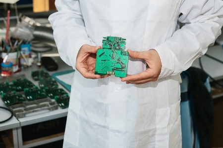 engineering laboratory. technology innovation design and hardware development. technician holding motherboard.