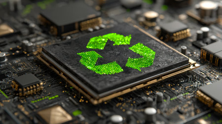 A glowing eco-symbol embedded in a detailed electronic circuit, blending modern innovation with environmental responsibility, evoking a futuristic focus on green tech.