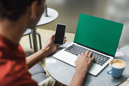 Blurred african american freelancer using devices near coffee in cafe