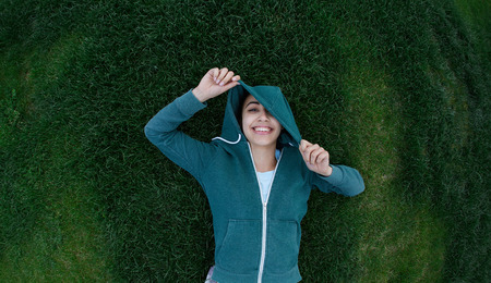 Portrait of young and sporty woman in sportswear lying on the green grass outside at the park on green meadow on cloudy day, Dnipro, Ukraine. The woman playfully puts the hood on her head, smiles, laughs and looks at the camera