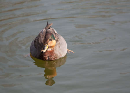 Male duck on the lake surface at sunny day.