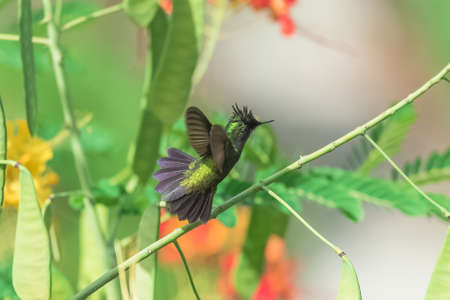 A juvenile Copper-rumped hummingbird defending his perch in a Pride of Barbados tree. Birds in a garden. Wildlife in nature. Hummingbird with colorful background.