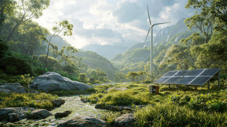 A stunning landscape showcasing wind turbines and solar panels amidst lush greenery. This serene scene highlights harmony between nature and renewable energy.