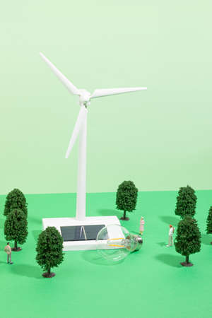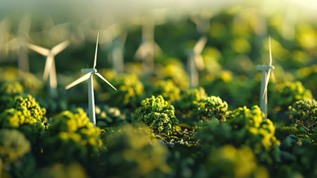 Miniature diorama of wind turbines on green terrain, symbolizing clean energy and environmental sustainability.