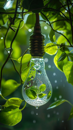 A light bulb rests amid fresh green leaves glistening with water drops, symbolizing the harmony between nature and innovative technology for sustainability.
