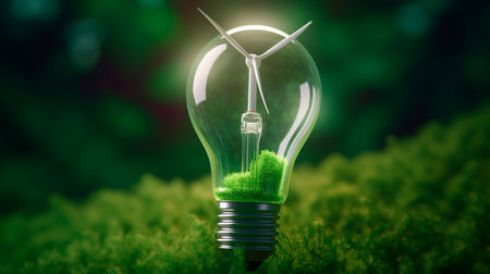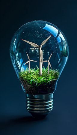 A creative depiction of a lightbulb filled with greenery, floating on water, with wind turbines in the background, showcasing the essence of renewable energy and ecological harmony.