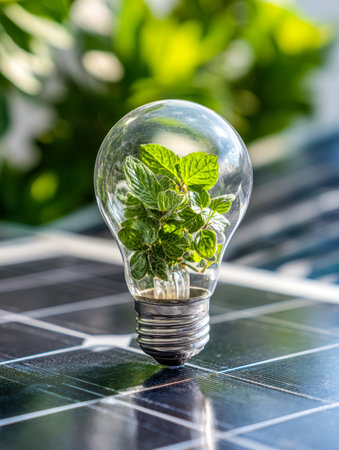 A vibrant, green stem emerges within a glowing filament, set against a backdrop of sleek solar panels, symbolizing sustainable growth and clean power.