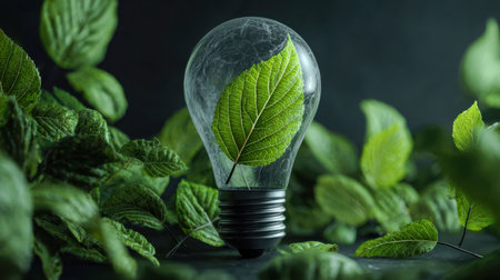 This captivating image features a light bulb with a vibrant green leaf inside, representing a fusion of technology and nature. It embodies sustainability and eco-conscious design, promoting environmental awareness and energy efficiency.