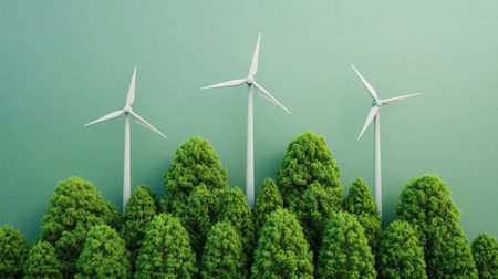 Sustainable energy concept with wind turbines and green leaves on a vibrant background reflecting eco friendly technology.