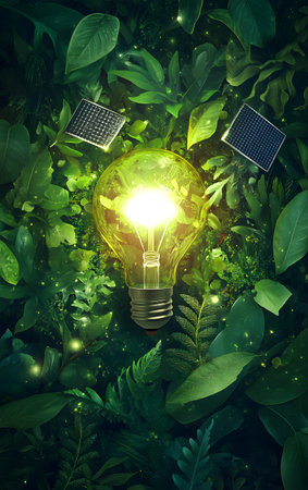 A glowing light bulb surrounded by lush green leaves, symbolizing sustainable energy and environmental awareness.