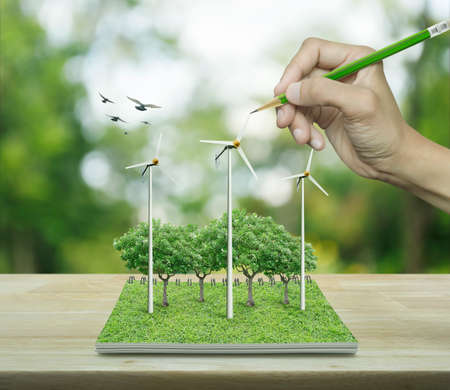 Hand with pencil drawing wind turbines, trees and birds from an open book on wooden table over tree blur background, Ecological concept