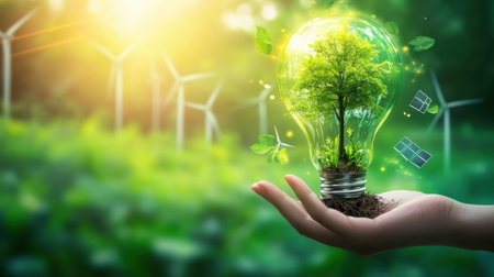 Image depicts a hand holding a light bulb with a tree inside symbolizing sustainable energy and environmental conservation. Wind turbines and solar panels in the background represent clean energy sources.