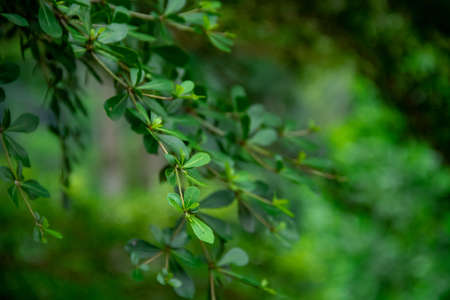 A macro photograph of a plant with small shiny leaves is similar to a legendary fantasy forest. Colorful juicy greens, perfect for the background. Soft photo processing