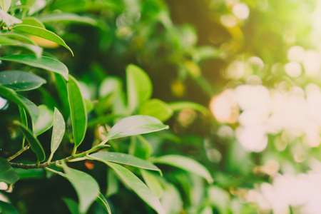Selective focus closed up tropical summer green leaf background with sunlight.