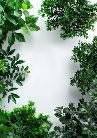 A serene collection of green leaves arranged around a soft, light background, creating a peaceful frame ideal for highlighting nature-inspired projects and designs.
