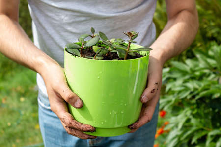 Young caucasian farmer in jeans holding plant in green pot standing in garden. Close up. Focus on hands.