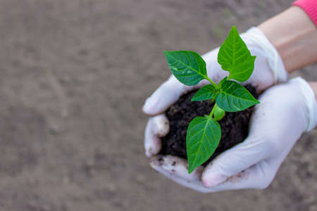 Women's and child's hands hold paprika plant with earth. early spring planting. selective focus