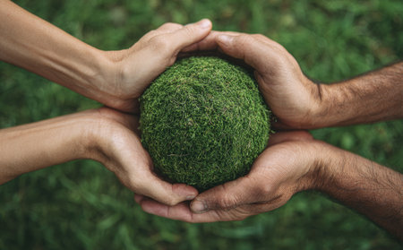 Two pairs of hands cradle a sphere covered in vibrant green vegetation. The image displays a close-up shot of the hands, highlighting the texture and color contrast against a blurred green background, suggesting an outdoor environment. This visual is suitable for concepts related to sustainability and ecological themes.