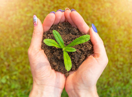 The soil in the hands of young women is planting seedlings. Close up plant in female hands. Care of the environment. Ecology concept. Hand holding young plant with sunlight.