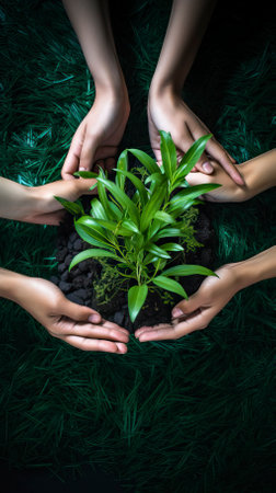 A pair of hands cradles a young plant emerging from rich soil, symbolizing growth and sustainability in nature. Perfect for eco-friendly themes.
