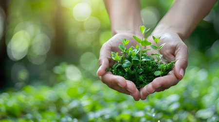 A close-up view of hands cradling rich soil with a young seedling, symbolizing growth and environmental stewardship in a vibrant natural setting.