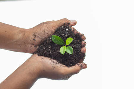 Young man Hands hold protect Small sprout tree plant in black soil on sunlight white background. Agriculture organic farmer, environmental day, new growth nurture care, save world spring concept.