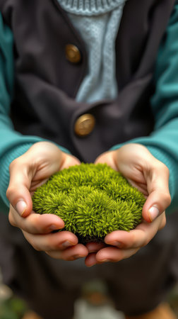 Hands carefully holding vibrant green moss in a natural setting during daylight hours