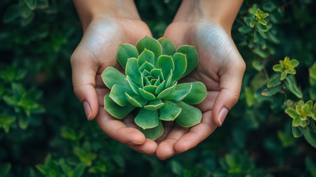 Close-up of hands gently holding a green succulent plant, symbolizing care for nature and sustainability, with a leafy green background.