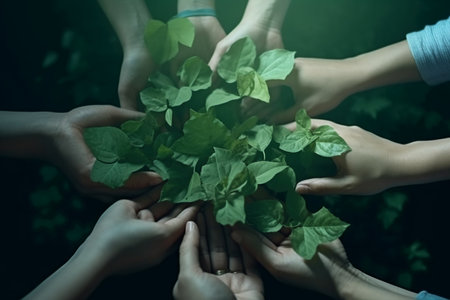 Hand holding green leaves among lush foliage, nature conservation concept